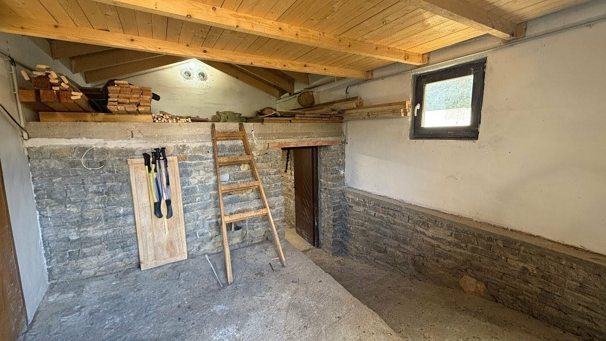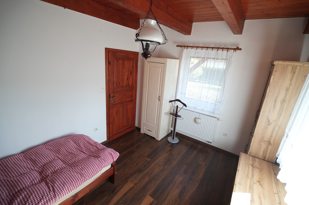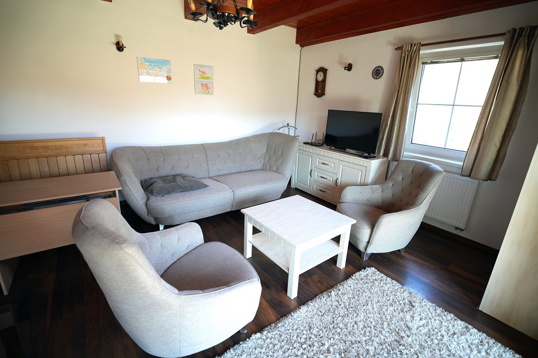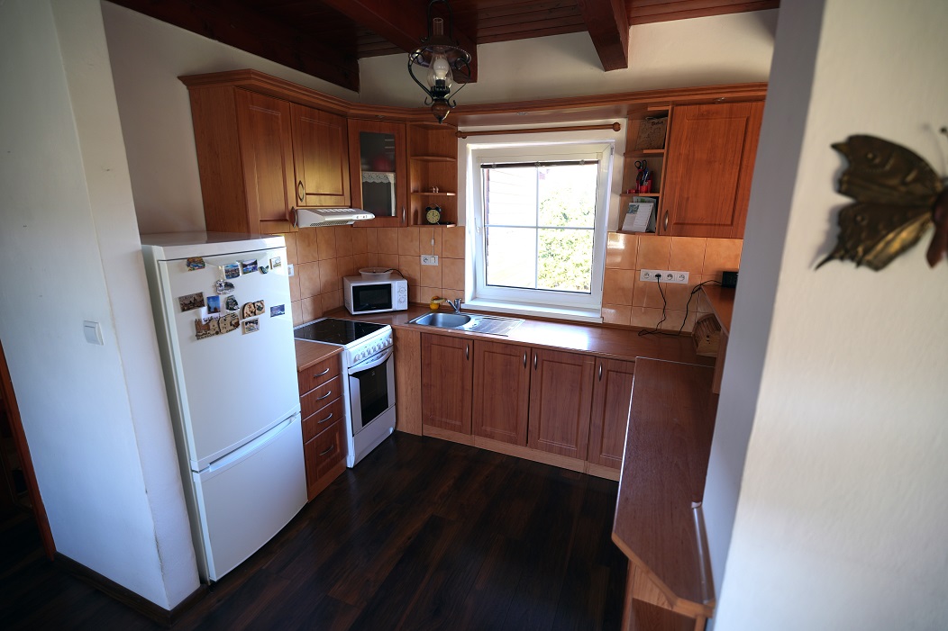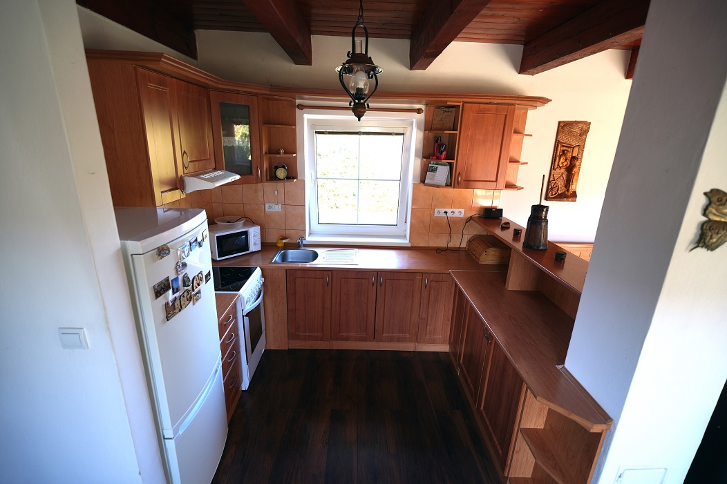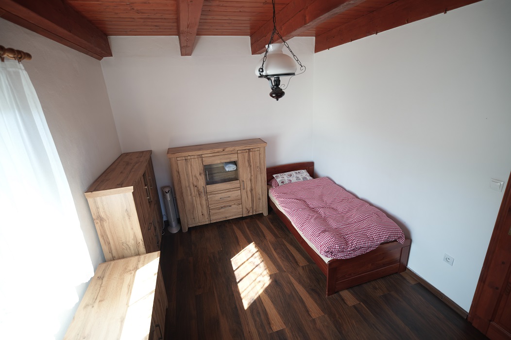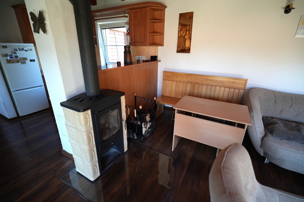 V prízemnej časti sa nachádza vstupná chodba, moderne riešená kuchyňa, ktorá je prepojená s obývacou izbou s krbovými kachľami a vstupom na kamennú terasu. Spálňa, kúpelňa s toaletou a sprchovým kútom, komora – špajza, technická miestnosť. Za technickou miestnosťou je vstup do kôlne s východom na dvor.